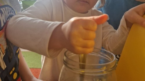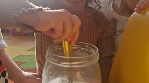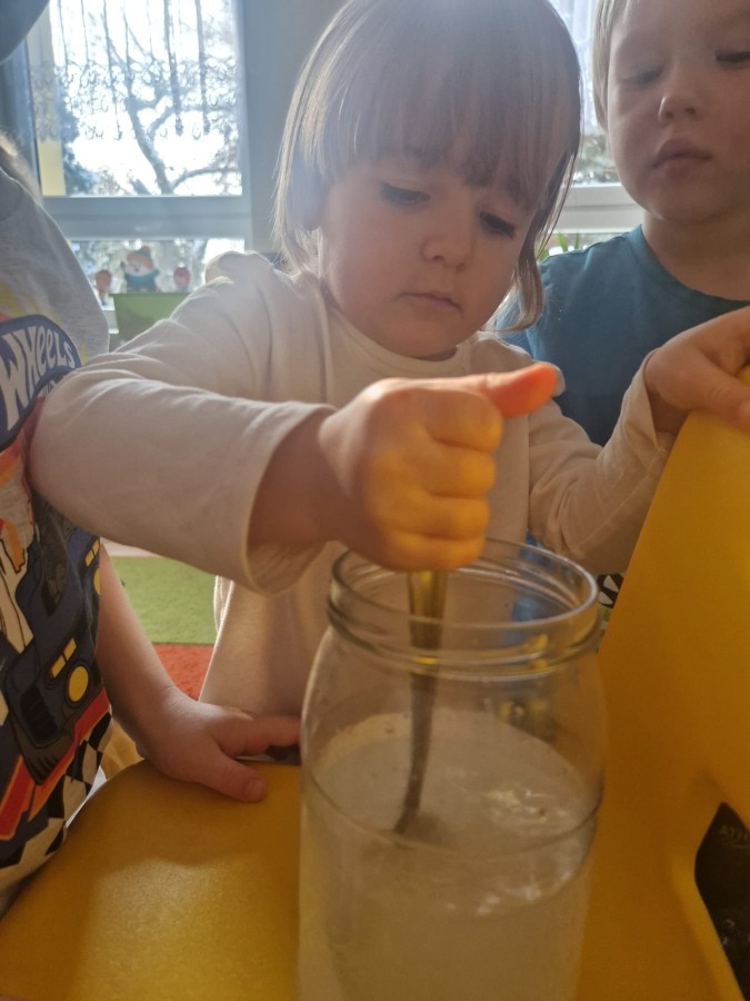 „Świat eksperymentów” wzbudził w dzieciach ogromne zainteresowanie i ciekawość. Przedszkolaki Jeżyki z zaangażowaniem obserwowały zmiany oraz chętnie dzieliły się swoimi spostrzeżeniami.