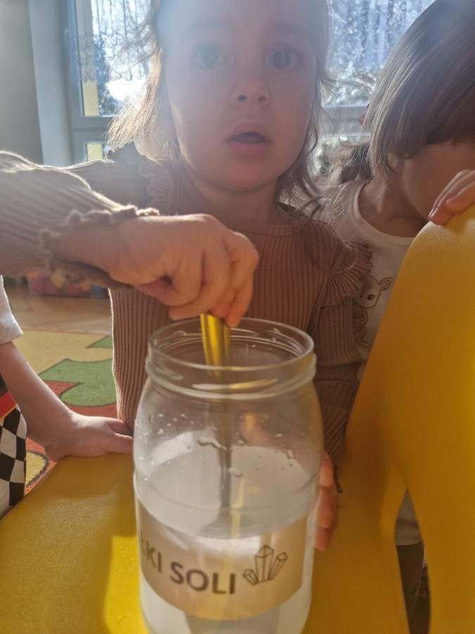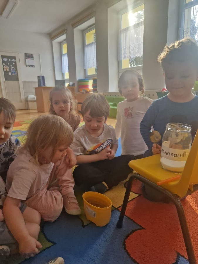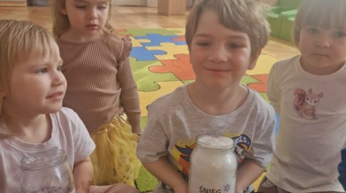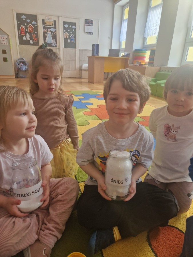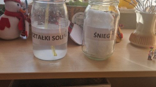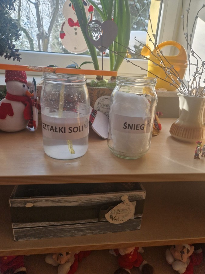 W ostatnich dniach w grupie Jeżyków prowadziliśmy zimowe eksperymenty ze śniegiem oraz solą. Dzieci obserwowały, jak śnieg reaguje na sól oraz jak w wyniku doświadczenia powstają kryształki soli.
