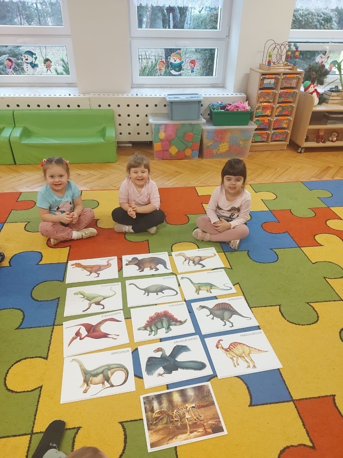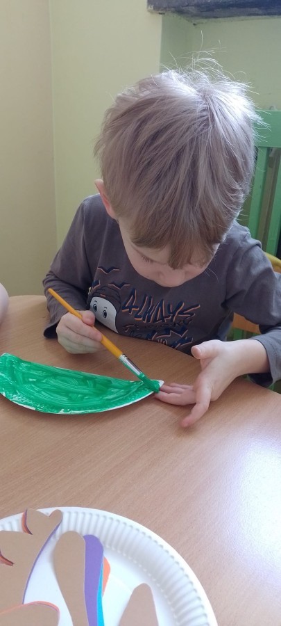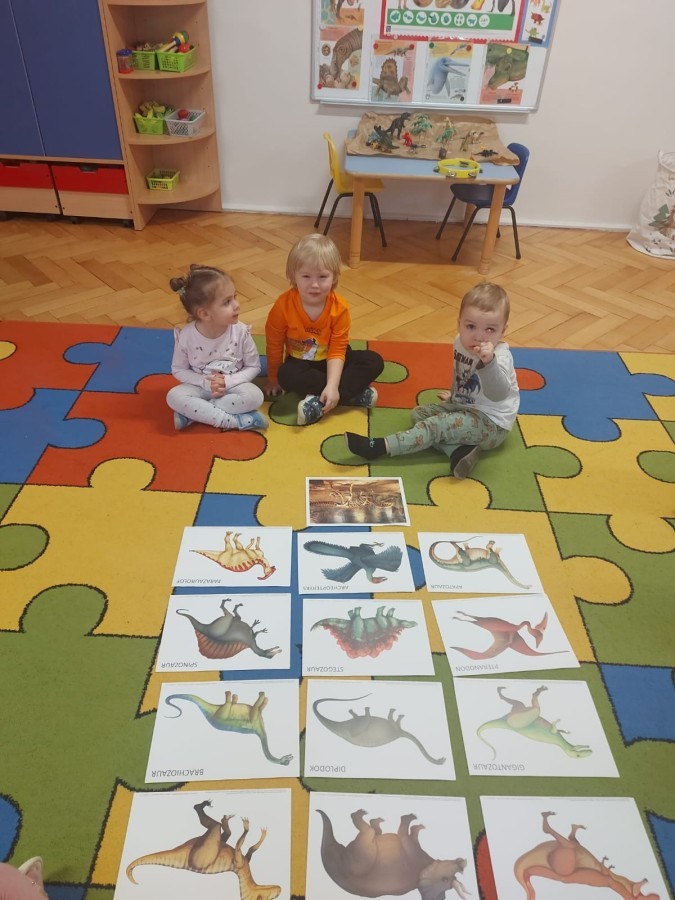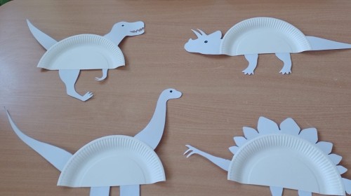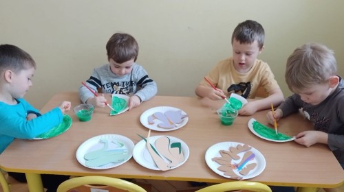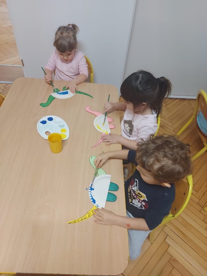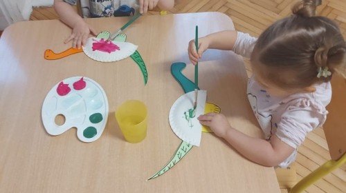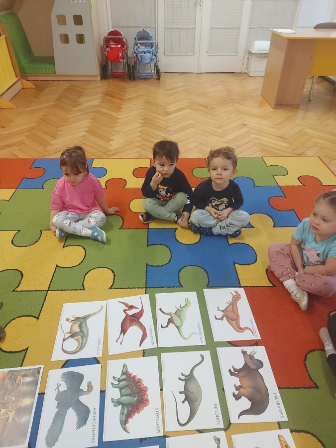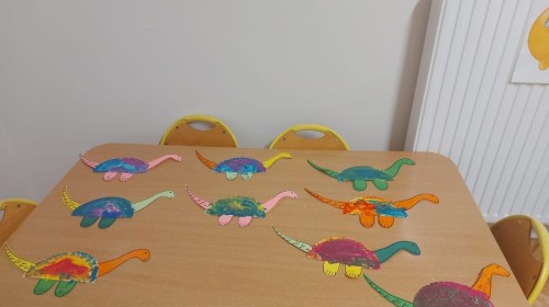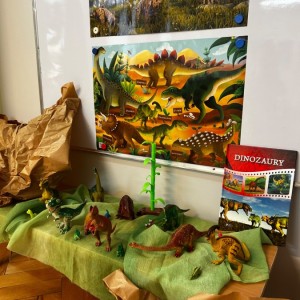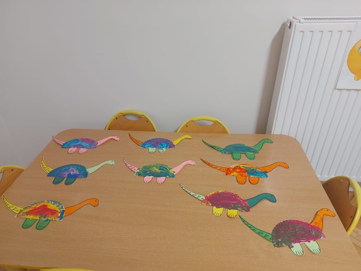 Podczas zajęć plastycznych dzieci wykonywały własne dinozaury z papieru i innych materiałów, rozwijając swoją wyobraźnię oraz sprawność manualną. Nie zabrakło także ruchowych zabaw tematycznych – zamienialiśmy się w małych paleontologów, oraz bawiliśmy się w dinozaurowe wyścigi.
