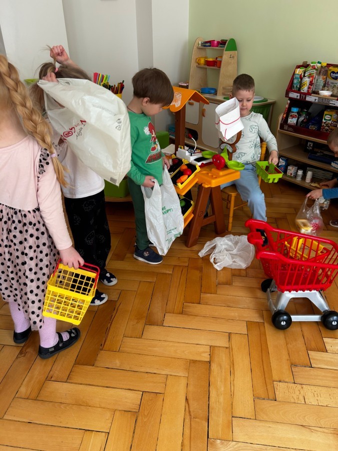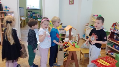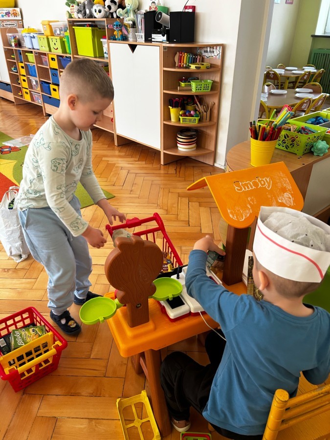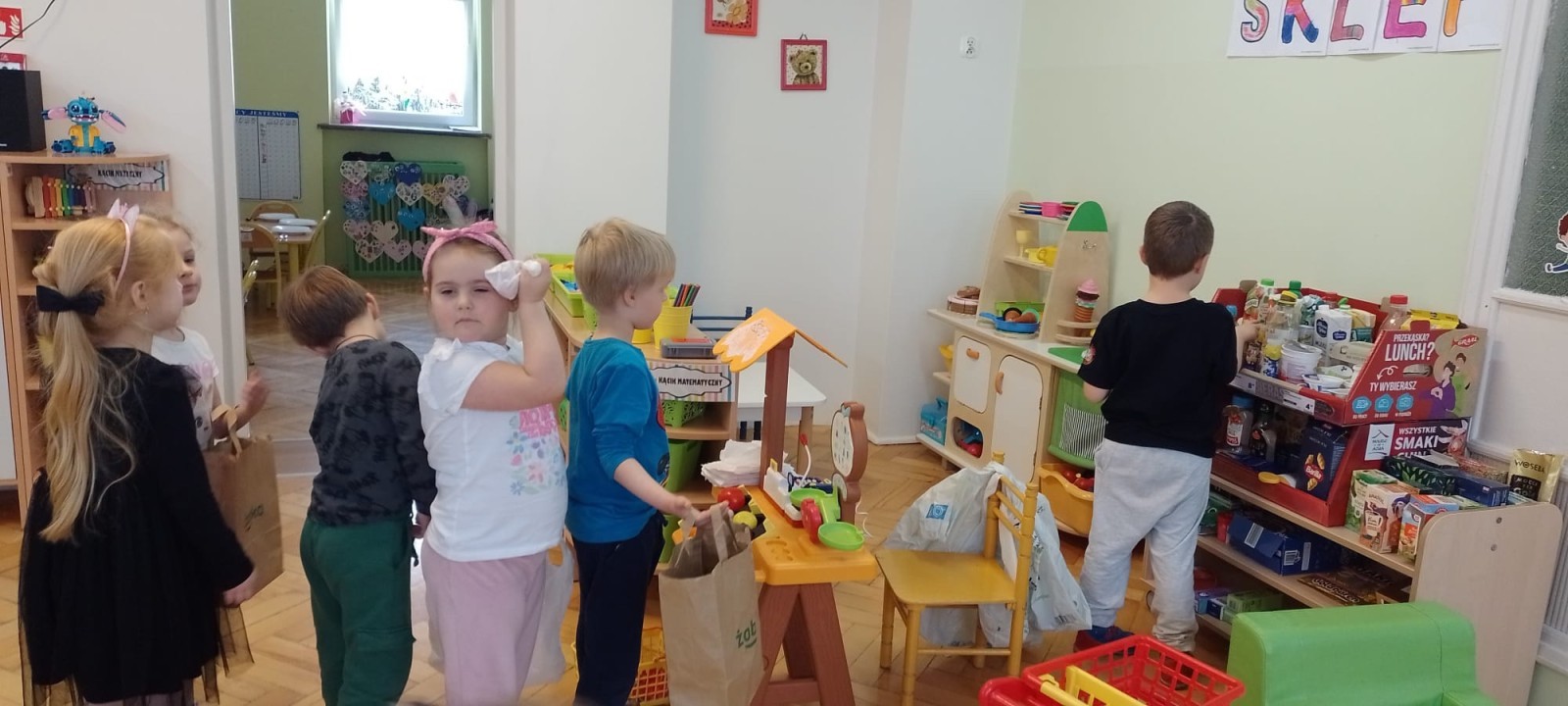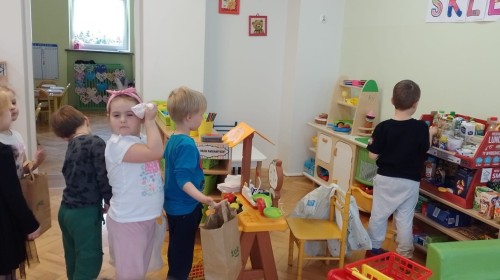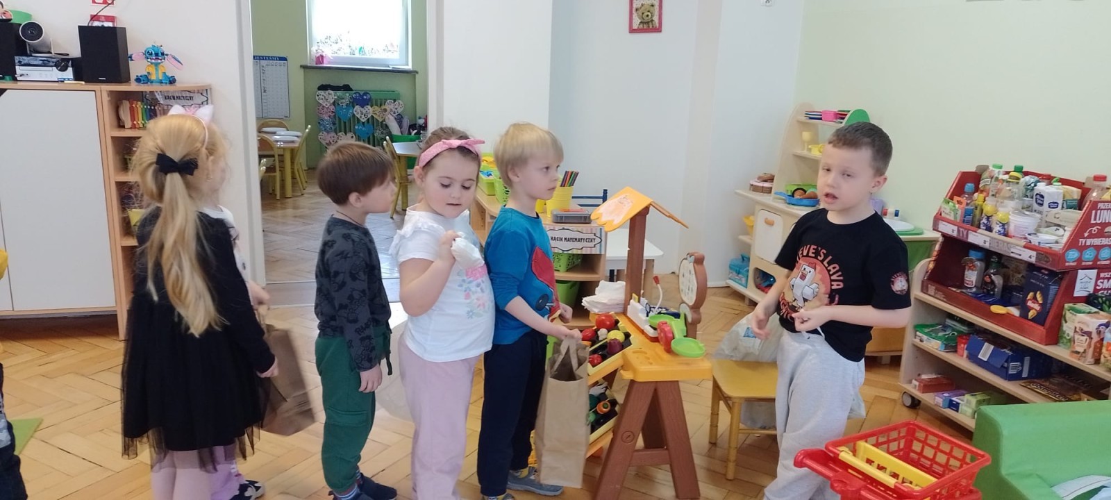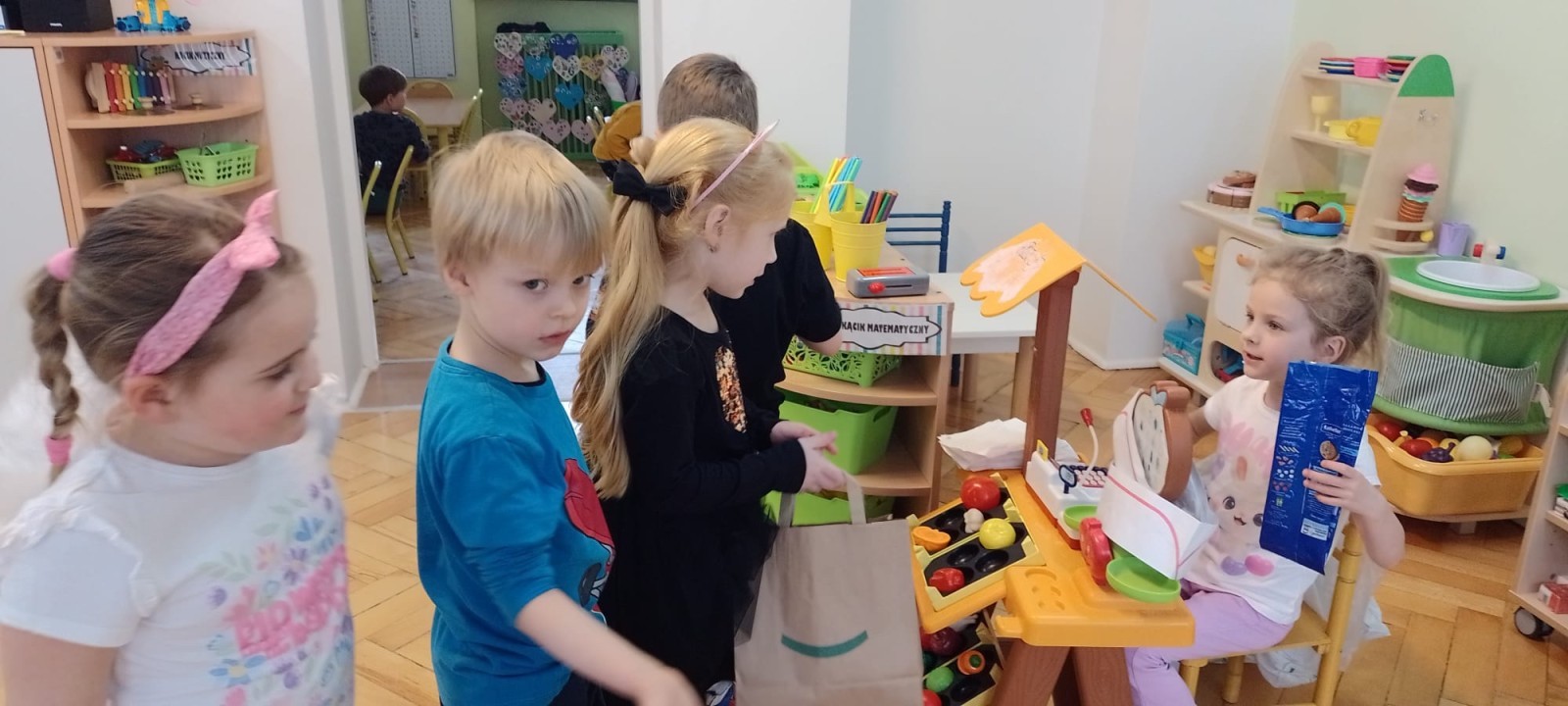Dzieci założyły swój własny sklep, w którym pojawiały się różnego rodzaju produkty, zamieniały się w małych sprzedawców. Dowiedziały się jak działa sklep, jak robimy zakupy oraz co robi sprzedawca. Przedszkolaki chętnie bawiły się w zorganizowanym w kąciku tematycznym „Sklep” wcielając się w rolę sprzedawców, kasjerów, klientów.