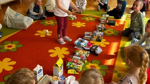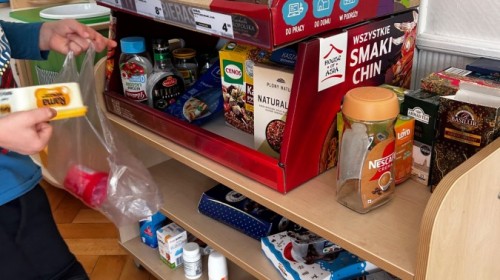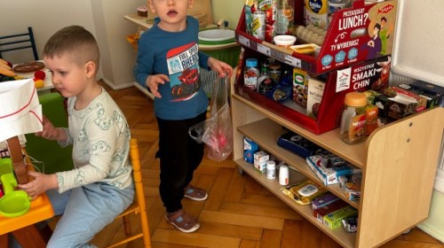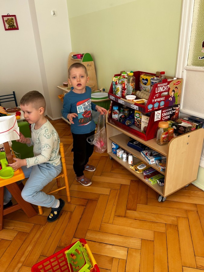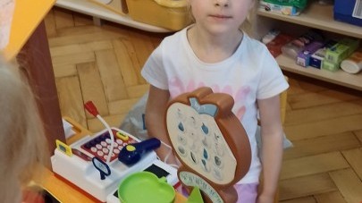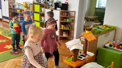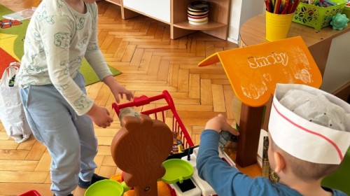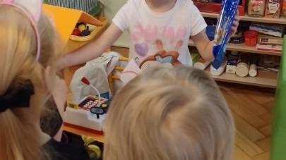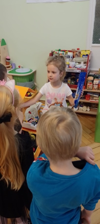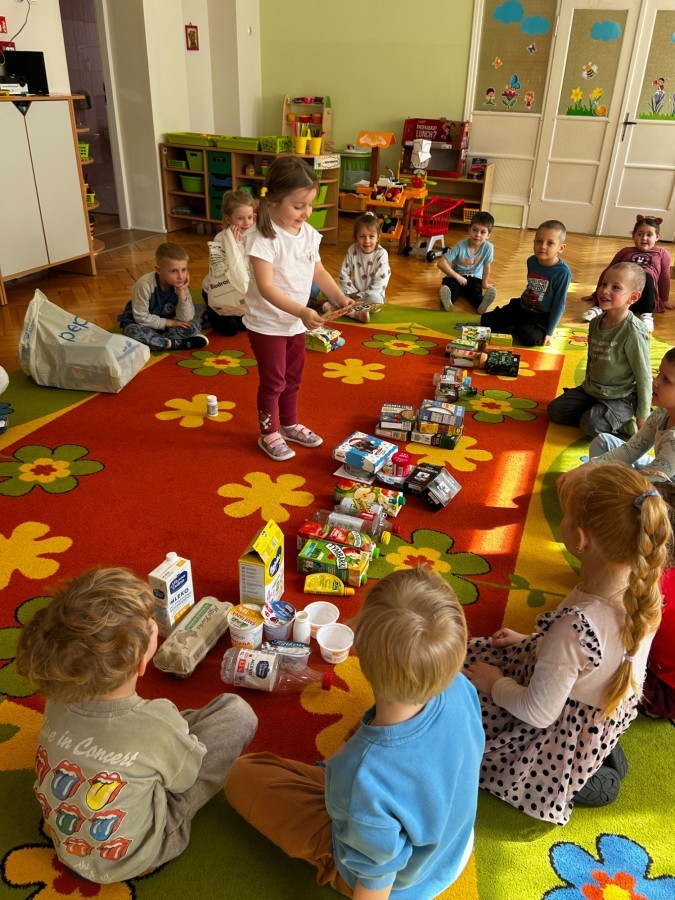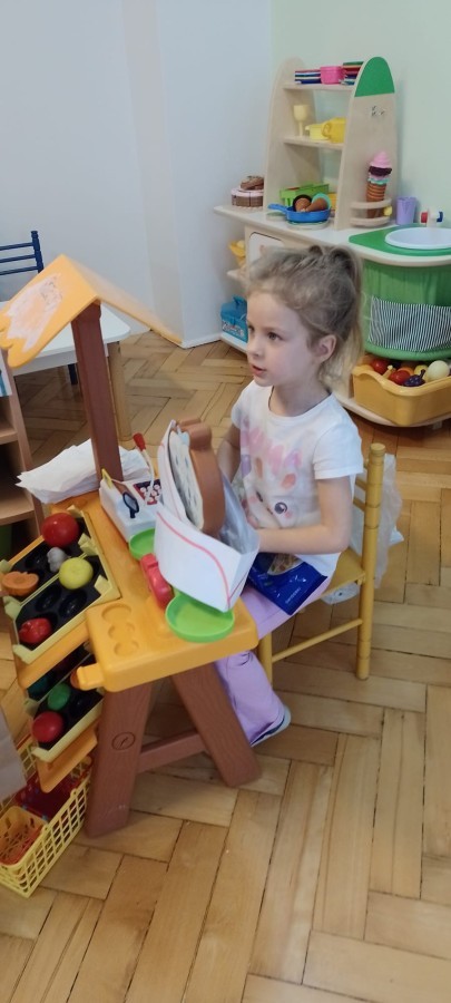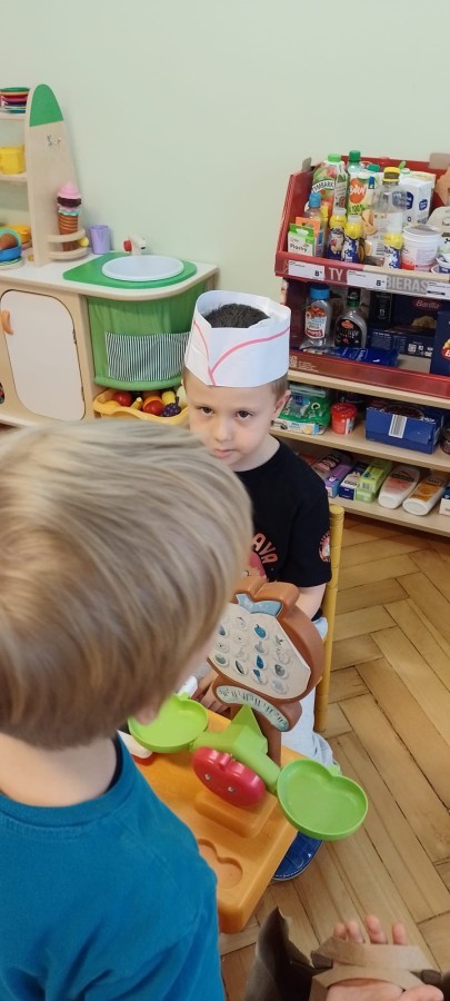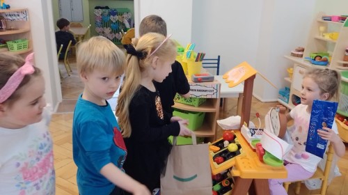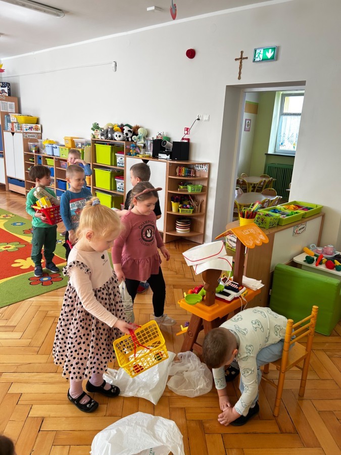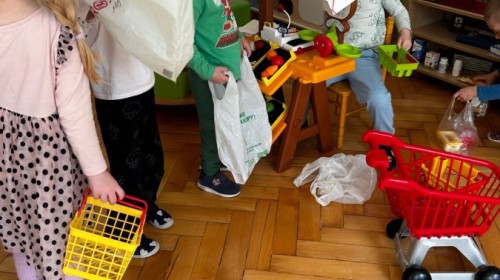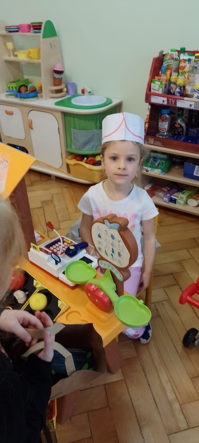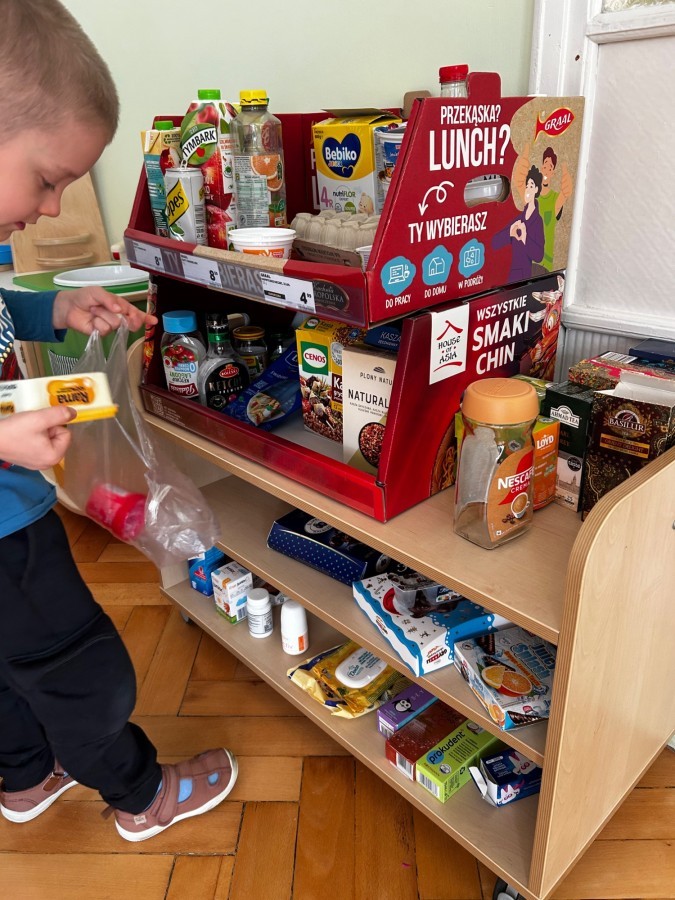 Dzieci założyły swój własny sklep, w którym pojawiały się różnego rodzaju produkty, zamieniały się w małych sprzedawców. Dowiedziały się jak działa sklep, jak robimy zakupy oraz co robi sprzedawca. Przedszkolaki chętnie bawiły się w zorganizowanym w kąciku tematycznym „Sklep” wcielając się w rolę sprzedawców, kasjerów, klientów.