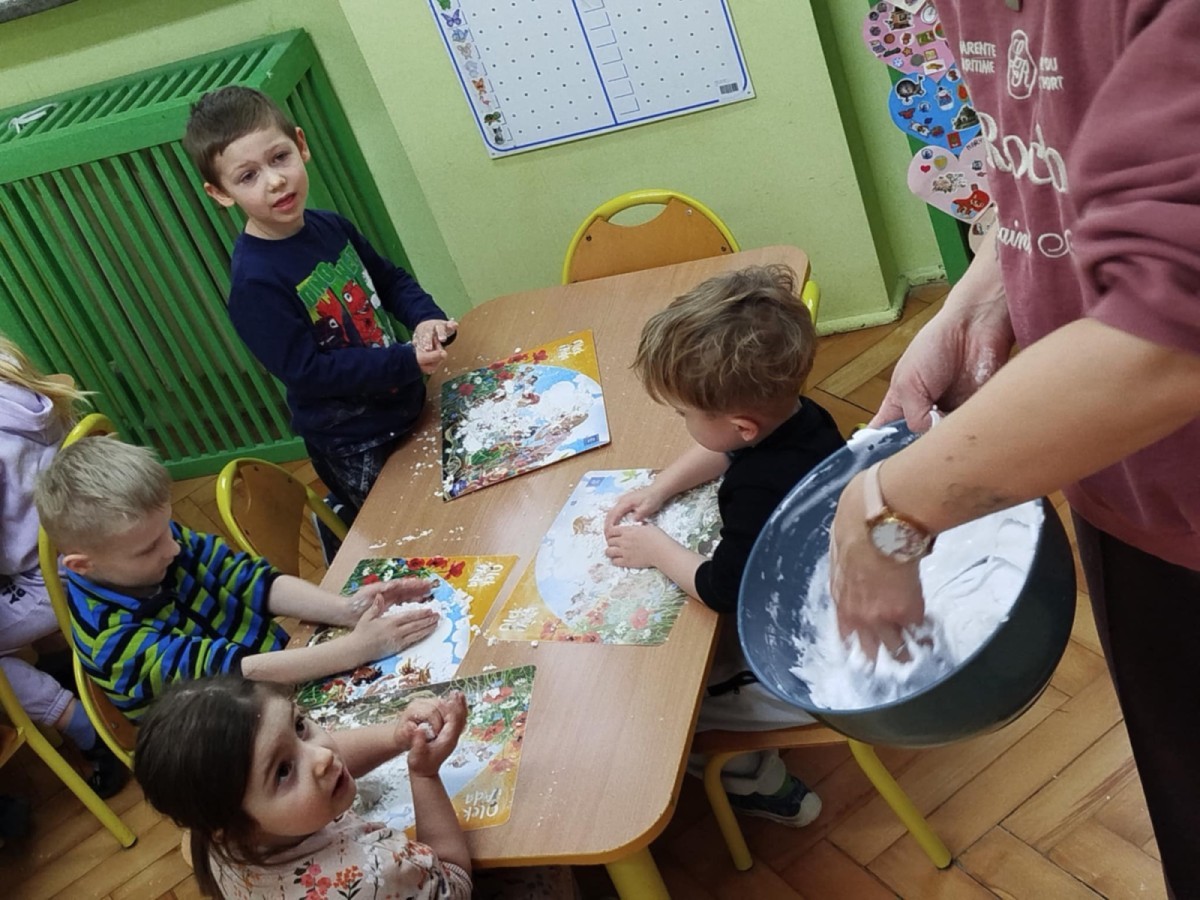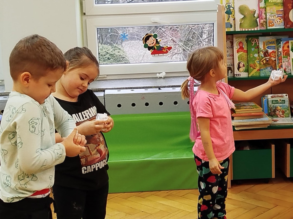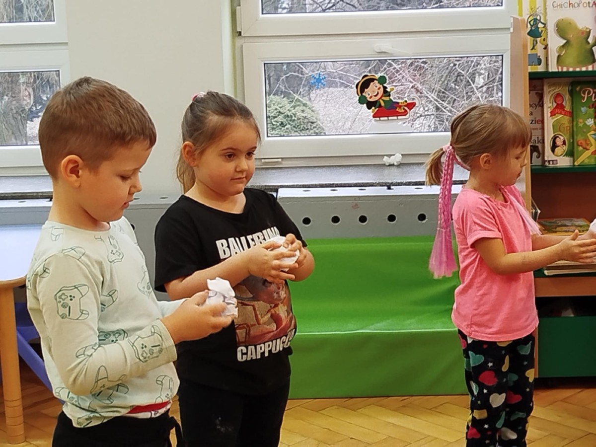 W ostatni piątek grupa zajączki sprawdziła, co może przypominać nam śnieg. Wspólnie dowiedzieliśmy się jak wykonać sztuczny śnieg, sprawdziliśmy jego strukturę i zapach oraz ulepiliśmy bałwanki. Kartki papieru i wata okazały się doskonałe do zrobienia śniegowych kul. Zabawa i doświadczenie, to doskonałe możliwości nauki!